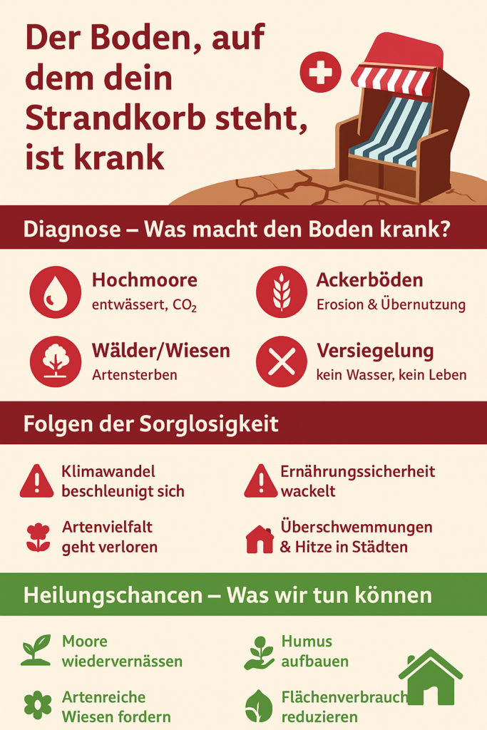 Du stellst deinen Strandkorb auf, lehnst dich zurück und genießt die Ruhe. Doch kaum jemand denkt darüber nach, worauf er eigentlich sitzt. Der Boden, der uns trägt, ist mehr als nur „Erde“. Er ist eine Vorratskammer, ein Filter, ein Speicher – und zunehmend krank. Der Boden in Deutschland leidet. Nicht nur an der Küste, wo der Strandkorb zuhause ist, sondern überall: auf Feldern, in Wäldern, auf Wiesen und in Mooren.